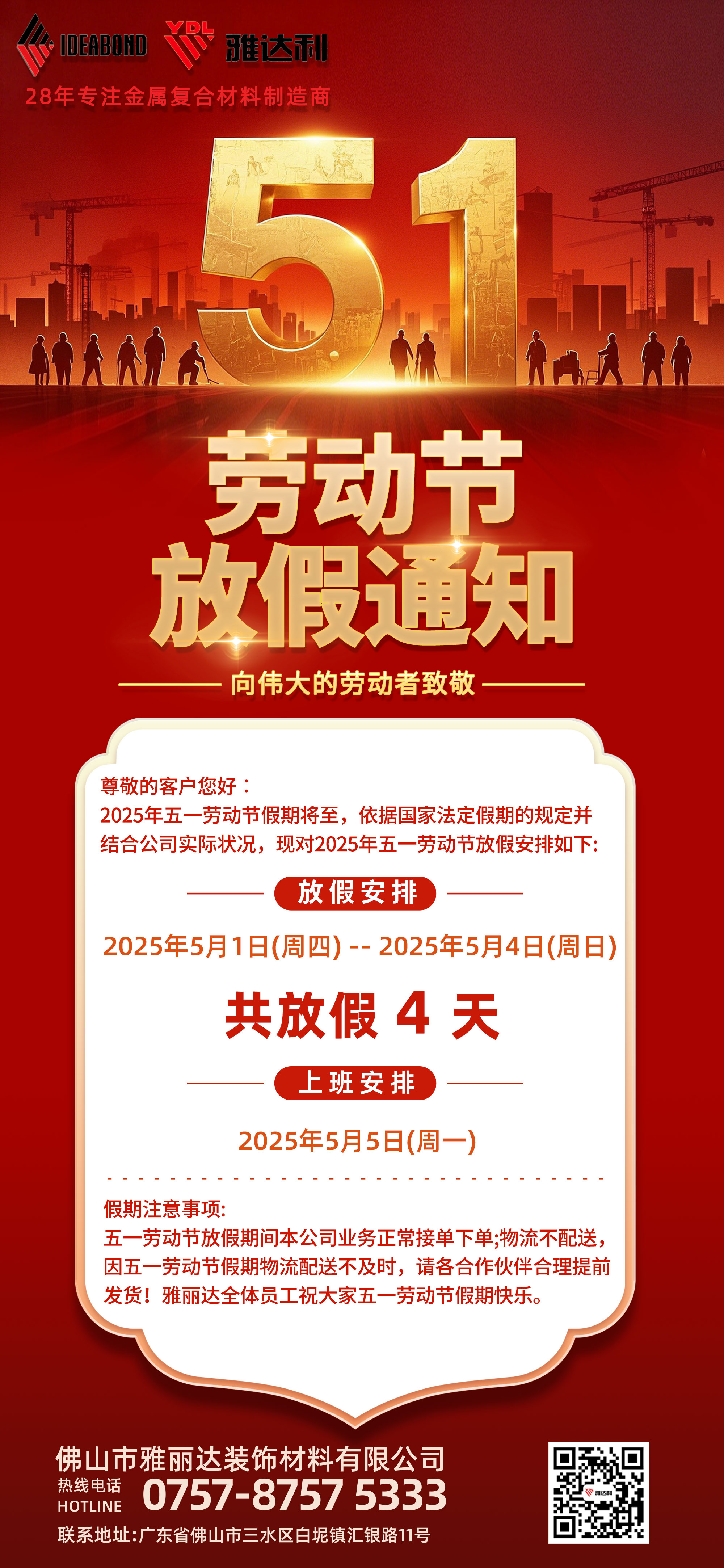 2025年五一勞動節即將來臨,佛山市17.c.com裝飾材(cái)料有限公司衷心感謝您長期以來的信任(rèn)與支持!根據國家法定節假日安排及公(gōng)司實際情(qíng)況,現將假期安排通知如下:
