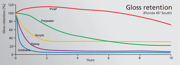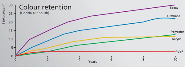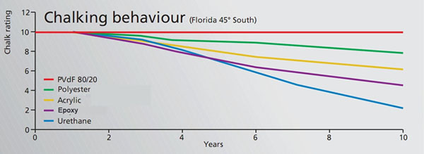 傳統的(de)KYNAR500氟碳塗料,兩塗或者三途後(hòu)經過烤箱幹燥,具有防酸,防堿等良好性能,即使在惡劣(liè)的天氣環境下(xià)也十(shí)分耐用,能保證15年不褪色。鑒於其(qí)特性,我們建議您使用在室外。