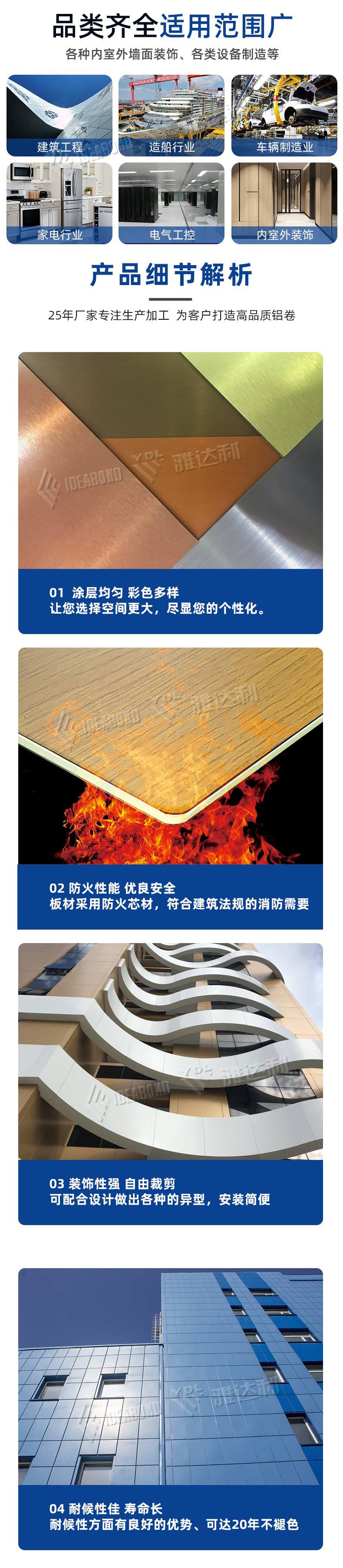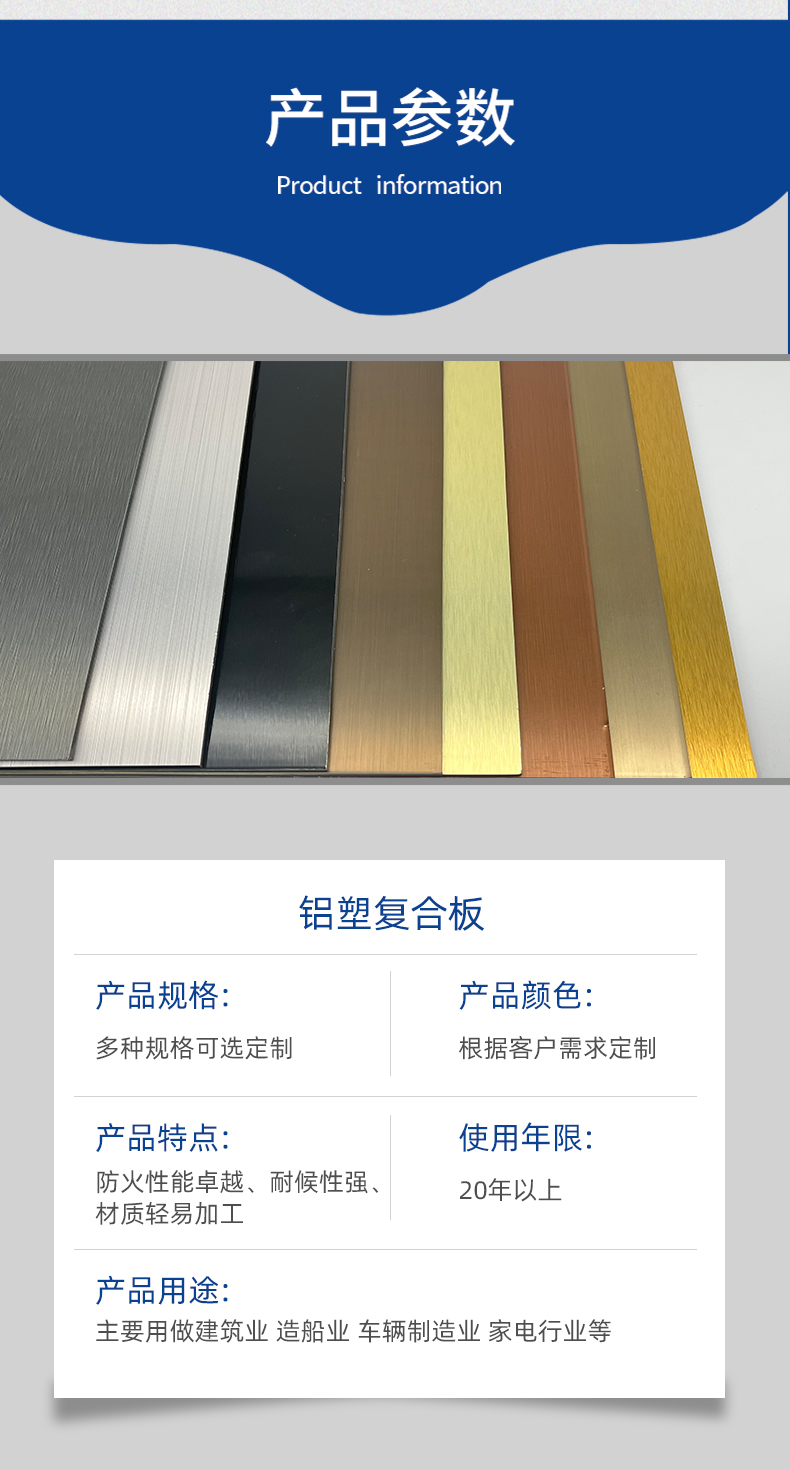工業(yè)產品用鋁塑複合板是一(yī)種性能全麵(miàn)、應用廣泛(fàn)的高性價比裝飾材料,可用於家居門板、電視背麵麵板、乒乓球台麵麵板、家電麵板、空調麵板、開關麵板及車輛(liàng)內飾板等領域。該產品具有優(yōu)異的穩定性和市場競爭力(lì),價格(gé)優勢顯著。材料結構(gòu)方麵,工業用鋁塑複合板采用高純(chún)度鋁(lǚ)合金板(3003/5005防鏽鋁係列)作為上下表層(céng),芯層(céng)為(wéi)聚乙烯或阻燃(rán)型聚乙烯,通過熱複合工(gōng)藝製成(chéng)的一(yī)種新型複合材料。