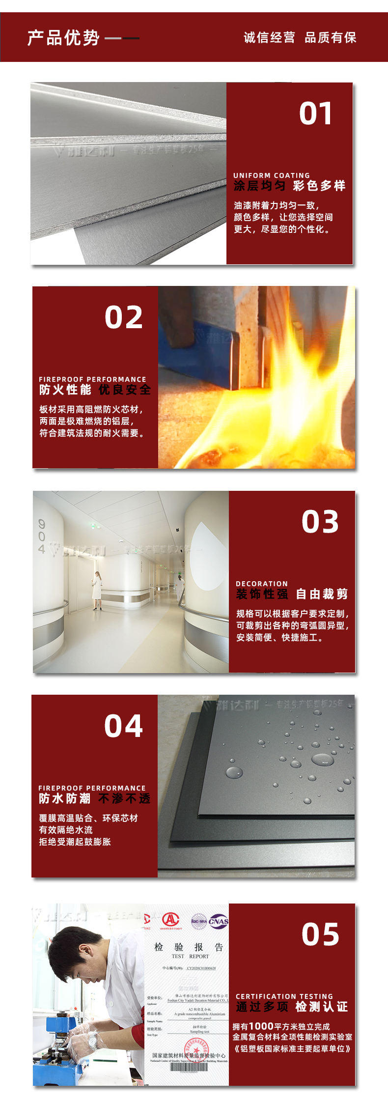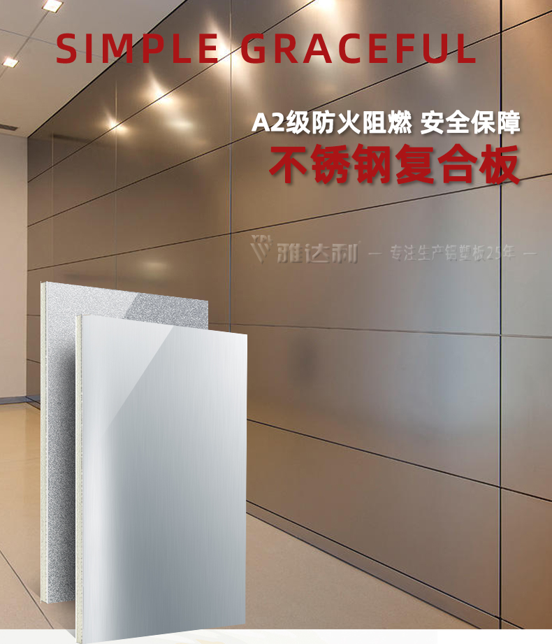 雅麗(lì)達不鏽鋼複合板是由兩片不鏽鋼為麵底板,高壓低密度聚乙烯為芯材(cái),經熱複合而形成的一種新型建築裝飾材料。彰顯不鏽鋼的高貴(guì)品質,光亮、質硬、耐磨、耐蝕性強。力學性能(néng)優異(yì),經久耐用。總厚度為4-6mm。